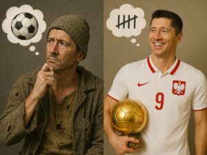 ❌Tak się nie zarabia pieniędzy, tak się je traci. Pomyśl czy Roberta Lewandowskiego pyta ktoś co myśli o piłce nożnej? Gdyby on tak o niej rozmyślał tylko, to pewnie wyglądał by jak ta jego wymyślona postać po lewej: