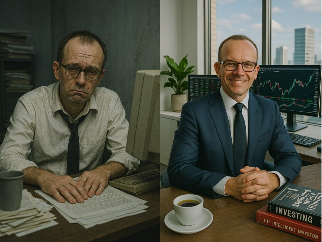 🫢W pewnym momencie byłem o krok od poddania się. Frustracja, wypalenie, brak efektów… Myślałem, że inwestowanie to nie dla mnie. Gdybym wtedy zrezygnował, dziś tkwiłbym w pracy, której nie lubię, za pieniądze, które nie spełniają moich oczekiwań. I wyglądałbym – dosłownie – jak po lewej stronie zdjęcia.