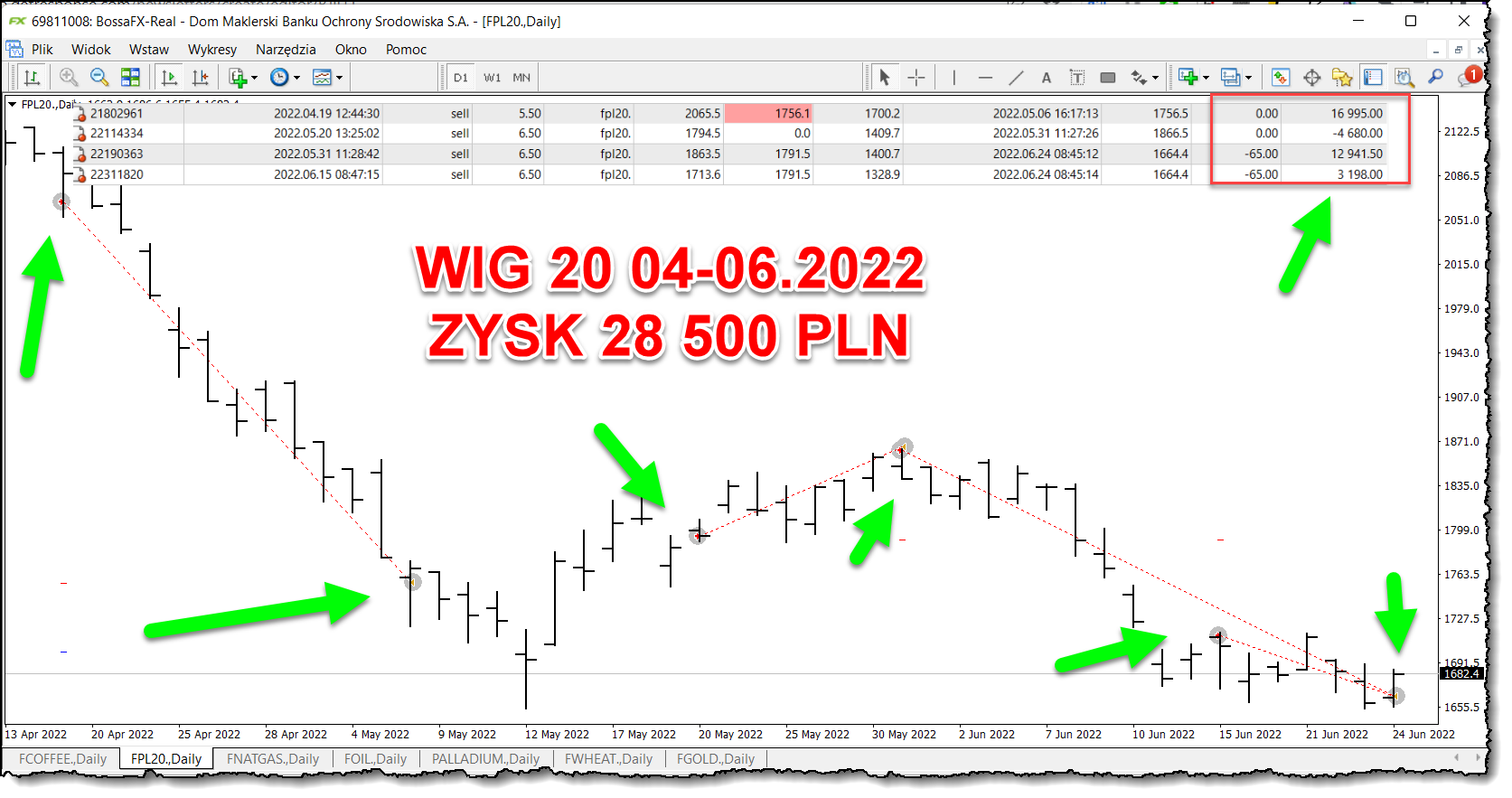 pokazałem moje kolejne zamknięte pozycje na WIG20, które miałem równolegle otwarte z pozycją na kawie, łączyny zysk jaki uzyskałem na pozycjach na WIG20 wynosi obecnie już 28 500 PLN i mam nadzieję, że to nie koniec.